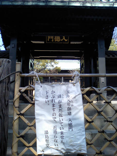 ![]() 水鉢?がありました。 そこには、徳川家の 葵の門が入っており ます。 幕府の加護があった 証ですね。 聖堂は度重なる火災や関東大震災 などでの改築をされていますが、 1704年に建立されたこの「入徳門」は今も当時の姿を 残しております。すばらしい。 近くで見たいのですが、張り紙発見→ 「漆がまだ乾いてません。 かぶれますので 近寄らないで下さい」 説得力十分です。